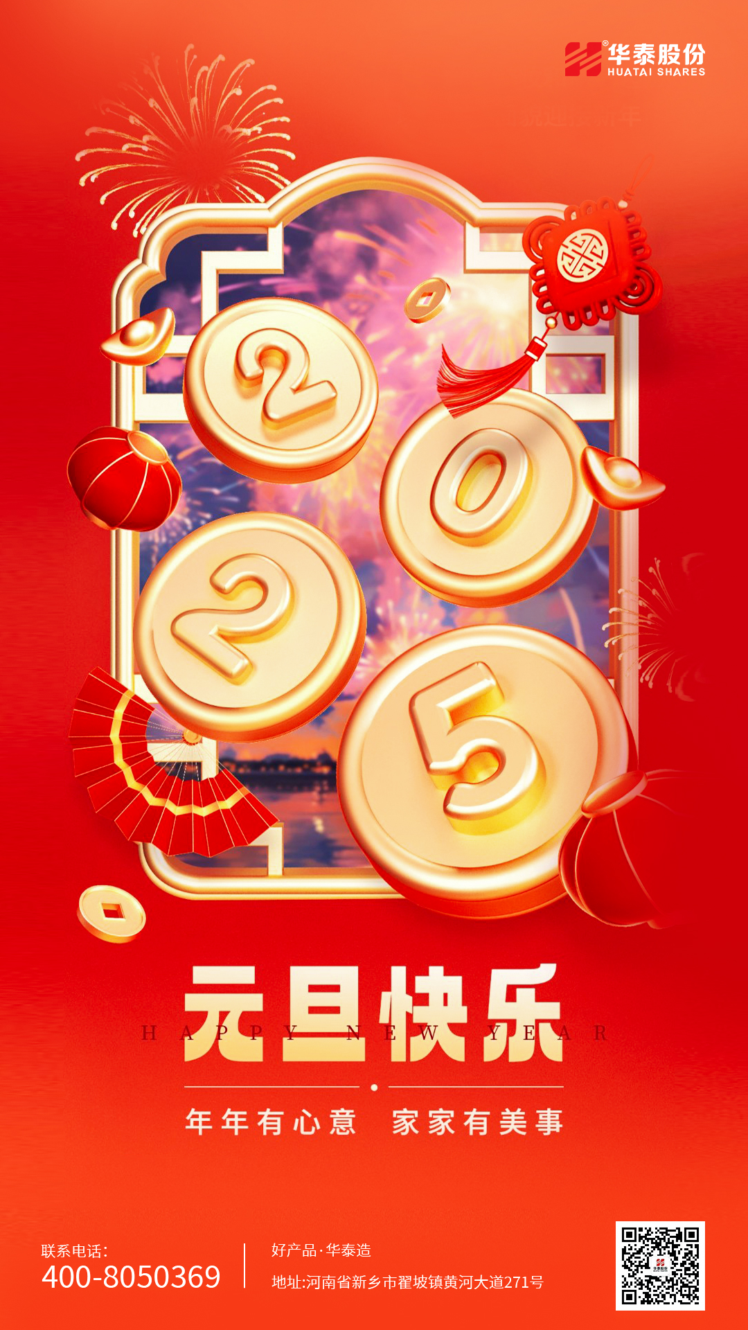 在元旦来临之际,华泰股份对全体员工发表新年致辞,同时也向广大客户、甲方、4008云顶国际网站的合作伙伴们送上诚挚的感谢和美好的祝福,感谢每一位朋友对河南华泰石化装备股份有限公司长期以来的肯定、支持和鼓励!祝愿大家新年大吉,鸿图大展,平安健康!